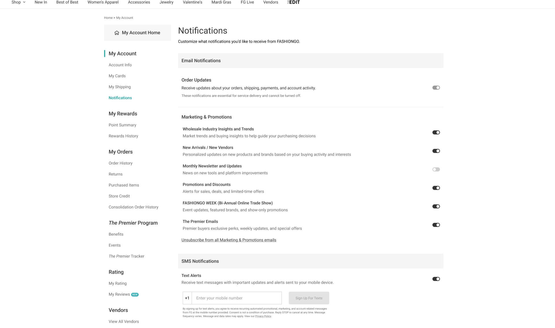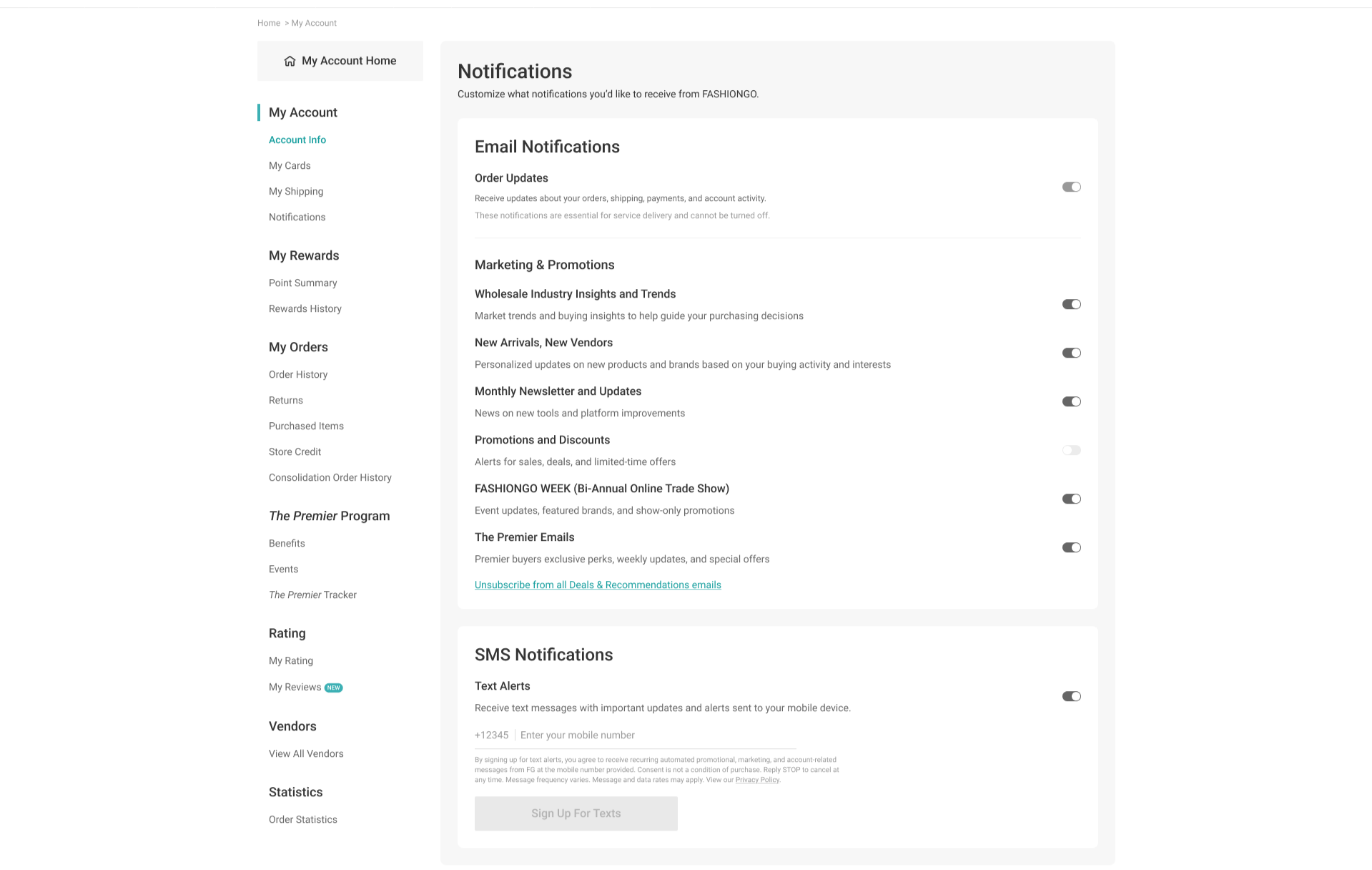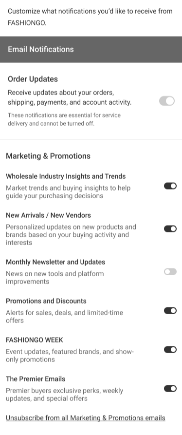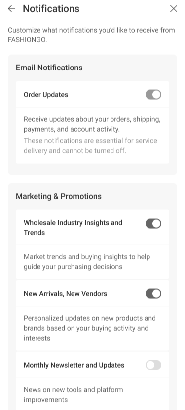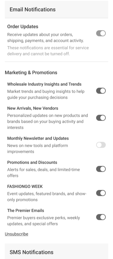 FASHIONGO notifications pageCreated a email and SMS notifications preference page in the My Account center of fashiongo.com and the FASHIONGO mobile app.